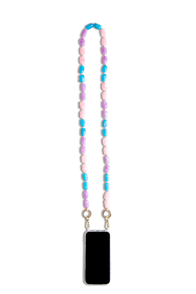La chaîne Mila Sky présente un mélange onirique de perles roses, bleues et lavande, inspirées des doux ciels pastel. Transformez votre téléphone en un accessoire charmant et emportez-le partout, les mains libres, grâce à nos chaînes bandoulière pour téléphone. Légère, colorée et d'une féminité absolue.
