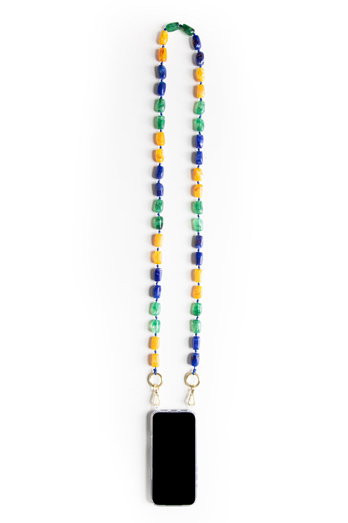 The Mila Capri chain features a vibrant mix of yellow, blue and green gem-style beads, inspired by bright coastal colours and sunny days. Turn your phone into a standout accessory and carry it everywhere, hands-free, with our crossbody phone chains. Fresh, playful and full of personality.